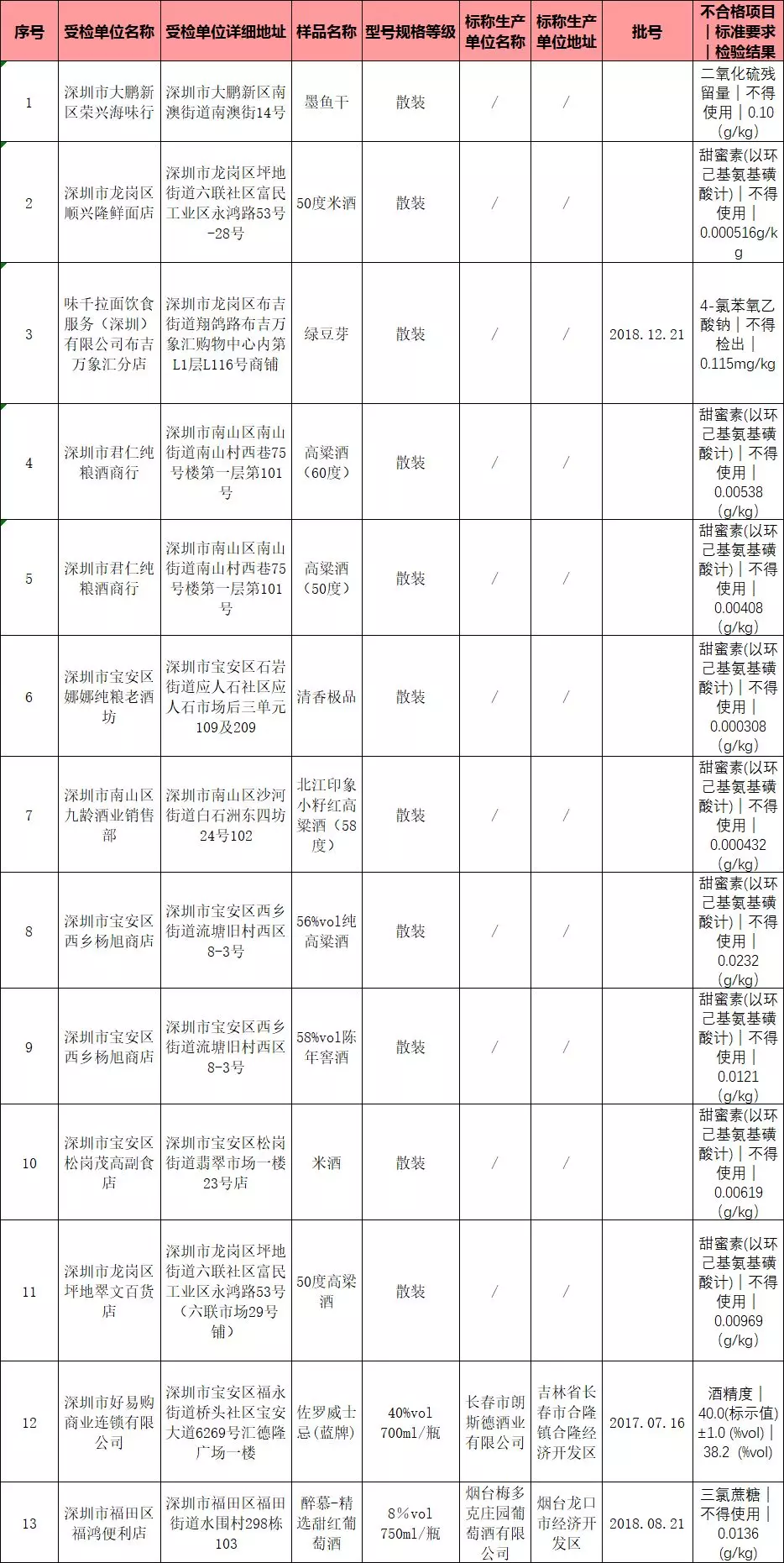 13批次不合格食品,其中酒類(lèi)占了11批次,大部分原因都在于檢出了甜蜜素。