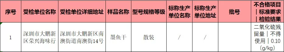 水產(chǎn)品有1批次檢出不合格,不合格樣品為墨魚(yú)干,不合格項(xiàng)目為二氧化硫殘留量。