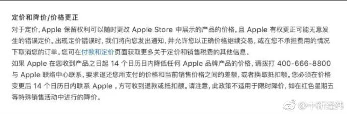 蘋果官方在公告中也指出,如果蘋果在用戶收到產(chǎn)品之日起的14個日歷日內(nèi)降低任何 Apple品牌的產(chǎn)品價格,用戶可要求退還差額。