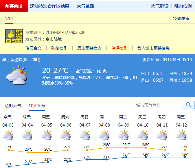 深圳新聞網(wǎng)2019年4月3日訊深圳今日氣溫20-27℃,多云,早晚有輕霧。4月3日至清明假期我市多云為主,降水少,氣溫高,空氣較干燥,沿海和高地間中有6-7級偏東風(fēng),氣象條件不利于降低火險(xiǎn)風(fēng)險(xiǎn),森林火險(xiǎn)預(yù)警信號將持續(xù)到清明假期。