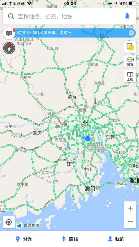 最后看看我們大廣東的路況,凌晨3點06分,廣州周邊明顯多了許多紅色“毛毛蟲”,每一條“毛毛蟲”的迷人紅色,想必都是各位司機大佬用車燈刷出來的!