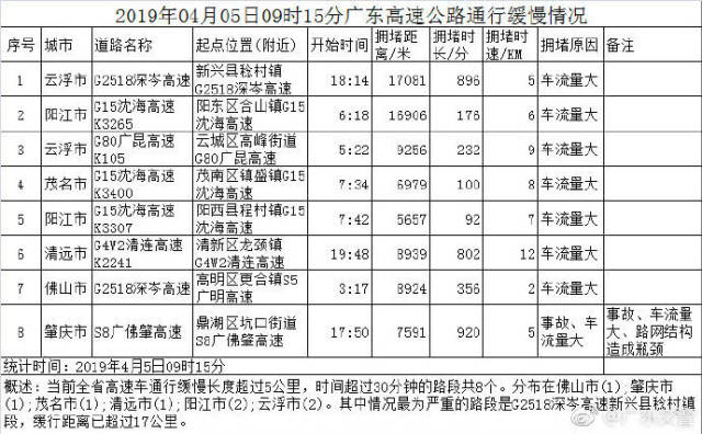 廣東交警部門此前預計,從4月4日至7日全省高速公路車流都將持續(xù)處于高位,出行最高峰出現(xiàn)在4月4日15時至5日凌晨2時。4月5日9時15分,廣東高速車通行緩慢長度超過5公里,時間超過30分鐘的路段共8個。