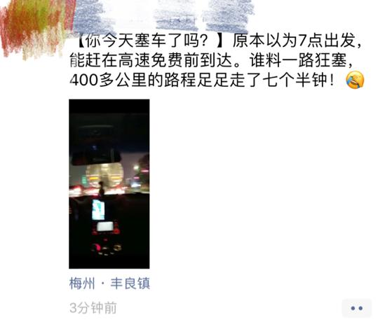 有坐大巴的朋友因為塞車時間遠超預期,遇上手機快沒電,心急不已,只能斷斷續(xù)續(xù)地開了又關(guān)機,以便與接他的家人保持聯(lián)系又留住最后一點電量。而家人也在當?shù)乜h城等了他四五個小時。