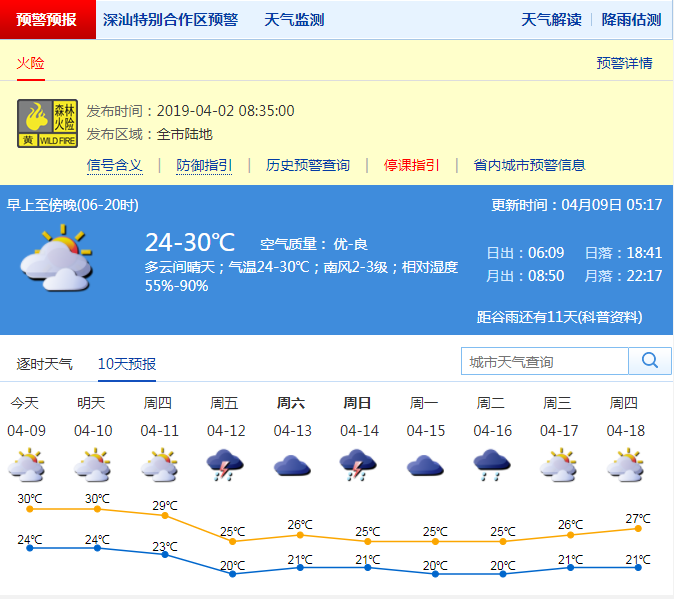 市氣象局預(yù)計,今日氣溫24-30℃,多云間晴天,本周前期仍無降雨,后期轉(zhuǎn)多陣雨。深圳市周一至周三(8-10日)可見陽光,早晚有輕霧或霧,天氣暖濕;周四至周日(11-14日)天氣不穩(wěn)定,有陣雨或雷陣雨,其中周五(12日)沿海和高地陣風(fēng)6-7級,氣溫下降。目前全市火險預(yù)警生效中,祭掃踏青等需注意用火安全,嚴(yán)防火災(zāi);下周后期注意防范雷電、沿海大風(fēng)。