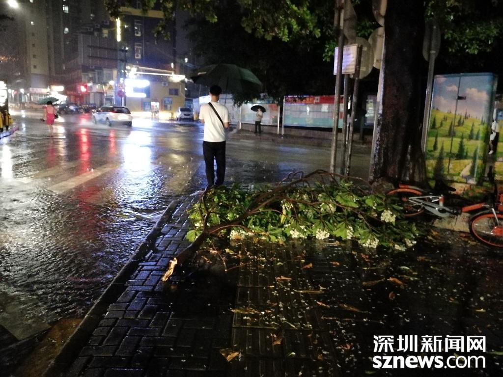樹枝折斷散落在路面上。