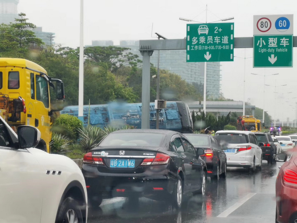 剛剛,濱海大道沙河西路 一大巴車(chē)隔離帶上側(cè)翻