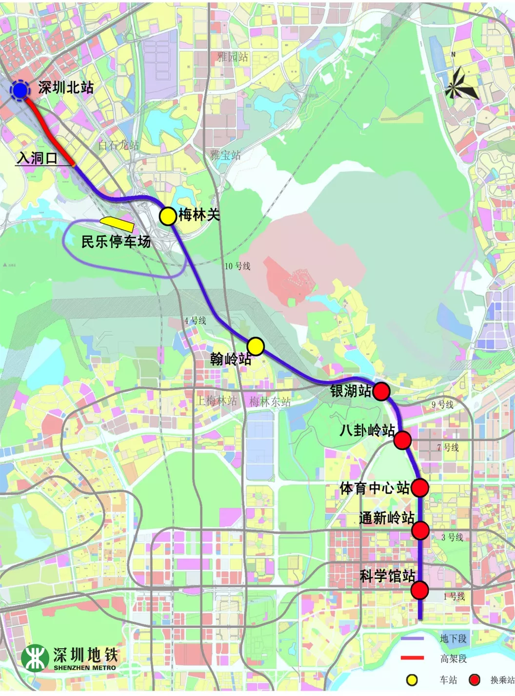 深圳地鐵6號線一期工程全長約49.4km,其中一期工程長約37.6km,起自深圳北站綜合交通樞紐,終止于松崗站,設(shè)車站20座(其中地下站5座,高架站15座),與4、5、11、13、15號線及廣深港客運(yùn)專線綜合換乘。