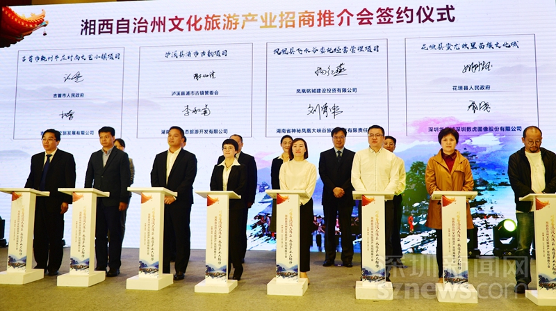 湘西州文化旅游產(chǎn)業(yè)推介會是“湘西自治州2019年湖南-粵港澳大灣區(qū)投資貿(mào)易洽談周”的重頭戲之一,由湘西自治州人民政府主辦,湘西州文化旅游廣電局承辦。會上簽約的8個旅游項目分別是:吉首市乾州牛莊時尚文藝小鎮(zhèn)項目、瀘溪縣浦市古韻項目、鳳凰縣飛水谷委托經(jīng)營管理項目、花垣縣蚩尤故里苗族文化城項目、保靖縣府庫紅石海景區(qū)項目、永順縣青坪鎮(zhèn)太平村“生態(tài)旅游康養(yǎng)度假區(qū)”項目、龍山縣太平山景區(qū)旅游項目、湘西吉鳳山生龍歡樂世界項目。國內(nèi)外眾多知名文化旅游投資商落戶湘西,標志著湘西正成為一方潛力無限的文化旅游投資熱土和產(chǎn)業(yè)高地。