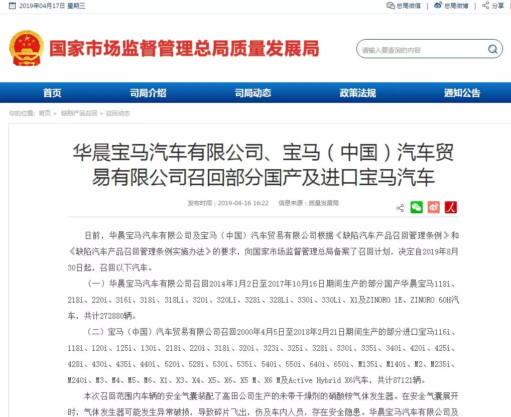 華晨寶馬汽車有限公司召回2014年1月2日至2017年10月16日期間生產(chǎn)的部分國產(chǎn)華晨寶馬118i、218i、220i、316i、318i、318Li、320i、320Li、328i、328Li、330i、330Li、X1及ZINORO1E、ZINORO60H汽車,共計(jì)272880輛。