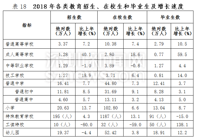 深圳新聞網(wǎng)2019年4月19日訊(記者 劉夢婷 通訊員 胡雪濤)4月19日,記者從深圳市統(tǒng)計局獲悉,深圳市2018國民經(jīng)濟與社會發(fā)展統(tǒng)計公報出爐:全市實現(xiàn)地區(qū)生產(chǎn)總值24221.98億元,比上年增長7.6%,常住人口達1302.66萬人。人均可支配收入57543.60元,居民人均消費支出40535.02元。總體來看,2018年深圳經(jīng)濟運行穩(wěn)健,主要經(jīng)濟指標表現(xiàn)良好,高質(zhì)量發(fā)展扎實推進。