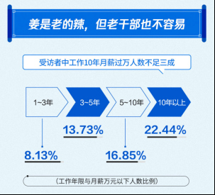 此外,受訪者月薪過(guò)萬(wàn)人數(shù)與隨著工作年限遞增,但工作10年月薪高于1萬(wàn)的人數(shù)依然不足三成。報(bào)告顯示,工作10年以上的受訪者中月薪過(guò)萬(wàn)人數(shù)比例為22.44%、工作5-10年月薪過(guò)萬(wàn)人數(shù)比例為16.85%、工作3-5年月薪過(guò)萬(wàn)人數(shù)比例為13.73%、而工作1-3年月薪過(guò)萬(wàn)人數(shù)比例是8.13%。這也從側(cè)面說(shuō)明了工作經(jīng)驗(yàn)不是影響工資水平的唯一因素,想要得到高薪,經(jīng)濟(jì)環(huán)境、工作地域、從事行業(yè)等因素也至關(guān)重要。