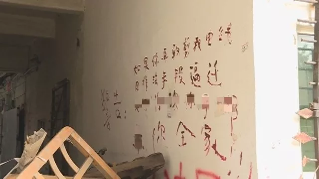 對(duì)方還將一樓大門上鎖,用建筑垃圾堵住了樓道,還在樓道墻壁上寫下了不少拒不搬離的文字。