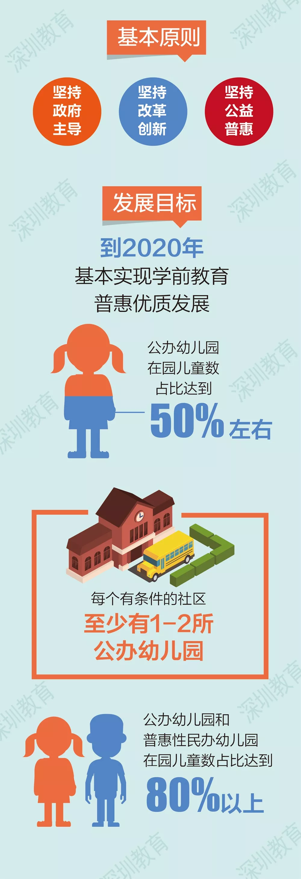 目前深圳共有各類幼兒園1771所,其中,公辦幼兒園共68所,占比僅3.8%。根據(jù)《意見》及《通知》的內容,到2020年,全市幼兒園總量預計達到1967所,其中公辦園和普惠性幼兒園占比達到80%以上,公辦園約984所,在園兒童占比達到50%;普惠性民辦幼兒園約590所,占比30%以上;營利性民辦幼兒園393所,占比20%以內。深圳將用3-5年時間,基本實現(xiàn)學前教育普惠優(yōu)質多樣化發(fā)展。