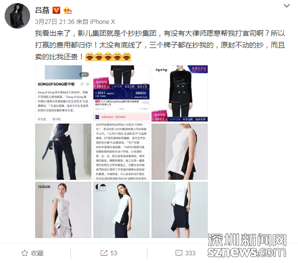 無(wú)獨(dú)有偶。5月5日,深圳影兒時(shí)尚集團(tuán)(以下簡(jiǎn)稱:影兒集團(tuán))正式向深圳市中級(jí)人民法院提起訴訟請(qǐng)求,就超模呂燕多次在微博上指責(zé)影兒集團(tuán)是“抄抄集團(tuán)”,造成影兒集團(tuán)重大名譽(yù)損失和巨額經(jīng)濟(jì)損失一事,起訴超模呂燕及其公司上海是你商貿(mào)有限公司不正當(dāng)競(jìng)爭(zhēng),要求兩被告立即停止侵權(quán)行為,賠償經(jīng)濟(jì)損失1000萬(wàn)元,并公開道歉。