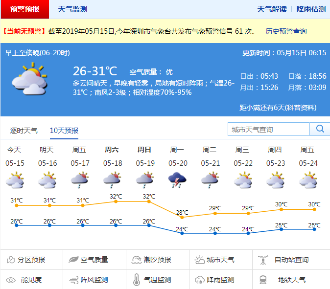 預(yù)計未來幾天持續(xù)炎熱,其中,15日深圳以多云天氣為主,局地有短時陣雨,早晚有輕霧,氣溫26℃至31℃;16日至19日持續(xù)炎熱,最高氣溫達32℃,以多云為主,局地有陣雨或雷陣雨;20日前后將有一次明顯降雨過程。