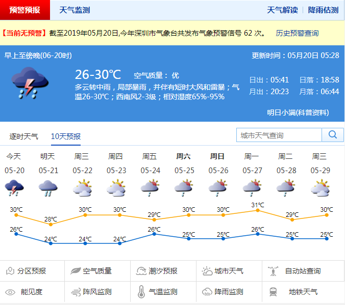 一年一度的“5·20”又來了,深圳近年來5月20日當(dāng)天局部暴雨以上的降雨的風(fēng)險(xiǎn)較高。果然,受冷空氣影響,今天白天全市有降雨,局部地區(qū)降雨量級(jí)可達(dá)到大雨到暴雨,并伴有雷暴和8級(jí)左右短時(shí)大風(fēng),天氣較劇烈,雷雨過程恰逢周一上班,市民注意合理安排出行。氣溫在25℃-29℃,高溫暴曬天氣緩解。