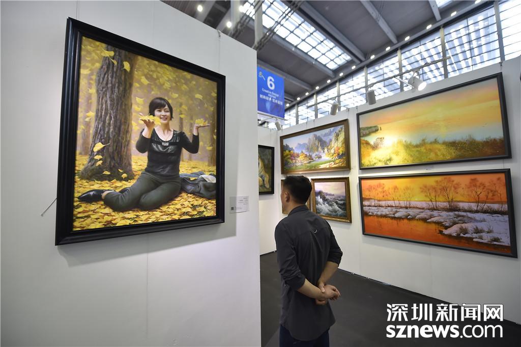 會展中心6號館,一位市民正在欣賞畫作