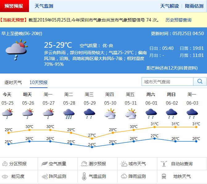 記者從深圳市氣象臺獲悉,25日大部分時間以陰天間多云為主,有短時陣雨或雷陣雨,局部地區(qū)雨勢較大,短時陣雨大概率出現(xiàn)在中午之后;氣溫25-29℃,中午時段體感相對較熱;南風(fēng)清勁,沿海和高地最大陣風(fēng)6-7級;相對濕度70%-95%,空氣濕度較大,略顯悶熱。26-27日多云為主,有短時(雷)陣雨,局部地區(qū)雨勢較大;展望28日前后有一場強(qiáng)雷雨過程。