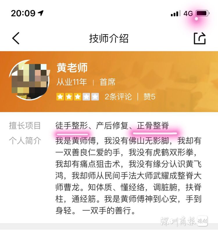 涉事黃師傅在美團(tuán)上介紹顯示為首席技師,其從業(yè)11年,擅長(zhǎng)項(xiàng)目為徒手整形、產(chǎn)后修復(fù)、正骨整脊。值得注意的是,該店在美團(tuán)上評(píng)價(jià)為五星滿(mǎn)分。
