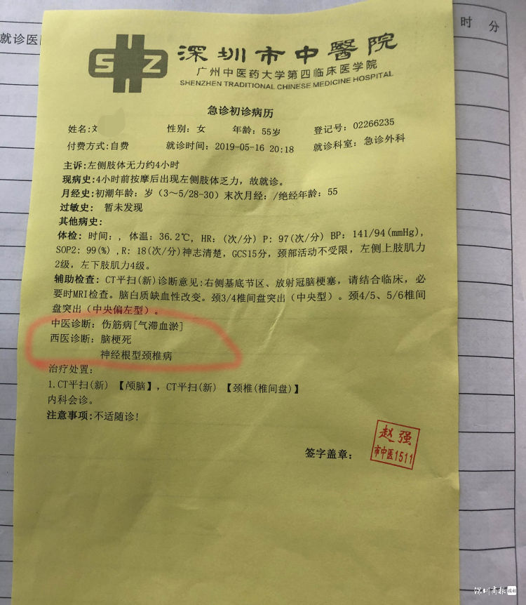 劉女士告訴記者,其事先已告知店家自己曾有過腦震蕩,但店家稱可以進(jìn)行按摩。"按摩師是用胳膊的紂關(guān)節(jié)大力按壓我的左側(cè)頸椎脖子部位,我痛得受不了,但按摩師表示痛就是刺激穴位。"大約20多分鐘左右后,劉女士左手左腰左腿開始麻木動(dòng)不了,人不能翻身。