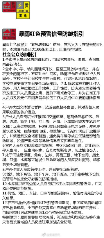 【上班天氣】暴雨:預(yù)計(jì)早晨6-9時(shí),全市陰天有暴雨,局部大暴雨伴有雷暴和6-7級短時(shí)大風(fēng),暴雨紅色分區(qū)預(yù)警信號生效中,請市民遠(yuǎn)離低洼易澇區(qū)、危房、邊坡、簡易工棚、擋土墻、河道、水庫等可能發(fā)生危險(xiǎn)的區(qū)域,注意交通安全。