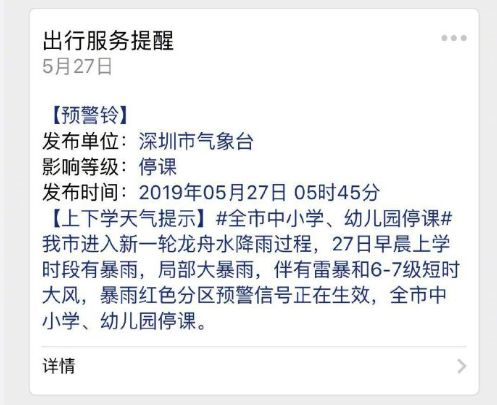 5月27日5時(shí)45分,深圳天氣微信公眾號發(fā)布出行服務(wù)提醒:深圳進(jìn)入新一輪龍舟水降雨過程,27日早晨上學(xué)時(shí)段有暴雨,局部大暴雨,暴雨紅色預(yù)警信號正在生效全市中小學(xué)、幼兒園停課。