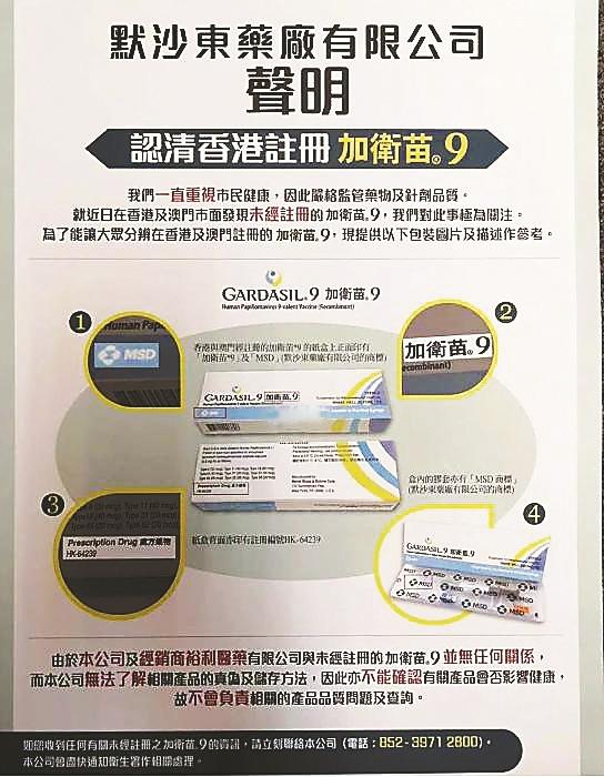 早前,HPV(全稱人乳頭狀瘤病毒)九價疫苗生產(chǎn)商默沙東藥廠曾發(fā)出聲明,把其公司指定的代理商,從未供應(yīng)任何“HPV九價預(yù)防疫苗”(GARDASIL9加衛(wèi)苗9)予位于佐敦嘉賓商業(yè)大廈的環(huán)亞體檢集團(tuán)(最早被投訴給內(nèi)地客人打水貨疫苗的公司)。