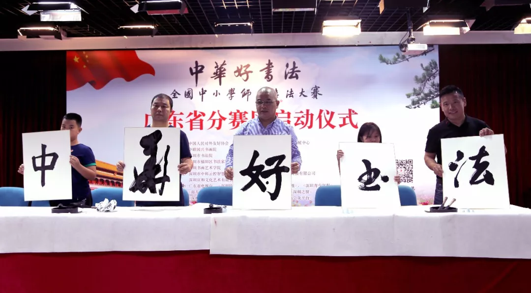 “中華好書(shū)法”全國(guó)中小學(xué)師生書(shū)法大賽廣東賽區(qū)組委會(huì)執(zhí)行副主任趙永金和教師代表趙軍、崔占海,學(xué)生代表劉子文、李唐心上臺(tái)為“中華好書(shū)法”全國(guó)中小學(xué)師生書(shū)法大賽廣東賽區(qū)比賽開(kāi)筆,在四尺斗方宣紙上寫(xiě)下了“中華好書(shū)法”五個(gè)大字,由此拉開(kāi)了“中華好書(shū)法”全國(guó)中小學(xué)師生書(shū)法大賽廣東省分賽區(qū)大賽的序幕。