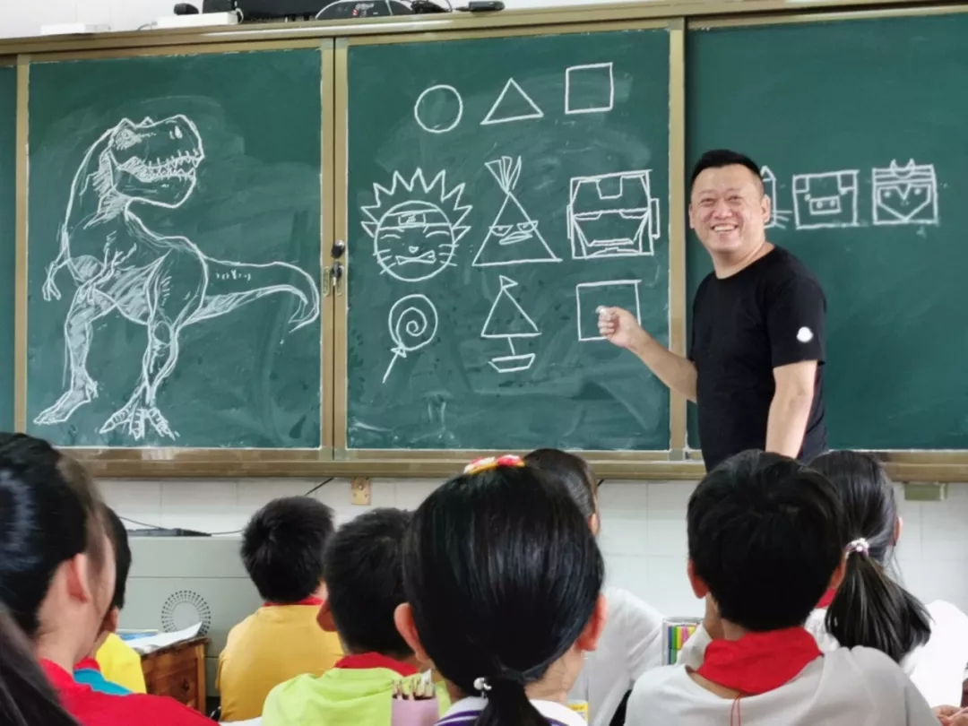 牛刀小試的李老師迅速吸引了同學(xué)們的注意力。接著,李老師用最簡單的圖形組合變化,帶領(lǐng)孩子們認(rèn)識到其實美術(shù)并不艱深。圓角方,這三個最基本的圖形,只要會組合,都可以變成一幅畫。