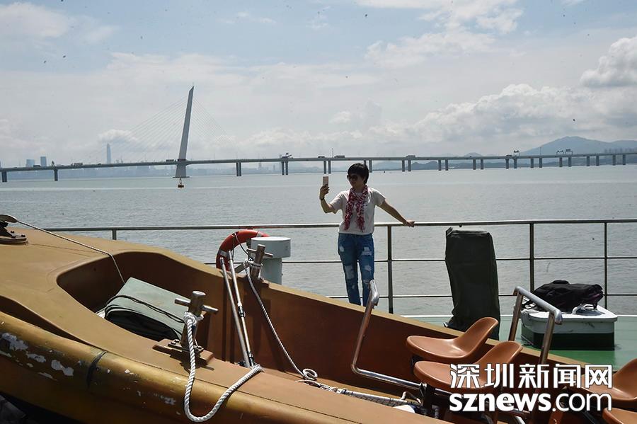 一位市民正在自拍,其身后為深圳灣公路大橋