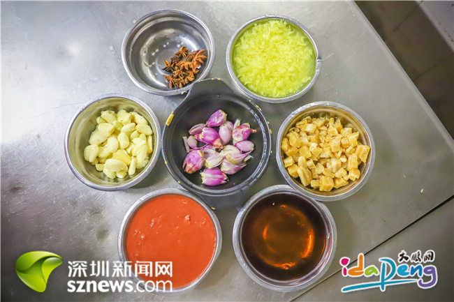 準(zhǔn)備好五花肉和燜好的芋頭,五花八門的材料也準(zhǔn)備輪番上場(chǎng)。歐石林將八角、料酒、醬油、鹽、姜蓉、蔥頭、蒜頭、南乳、片糖粒和花生油等細(xì)心地按比例分配在每個(gè)調(diào)料碟里,在他看來,一道好菜正是這些調(diào)料的“秀場(chǎng)”,但拿捏精準(zhǔn)卻不是件易事。