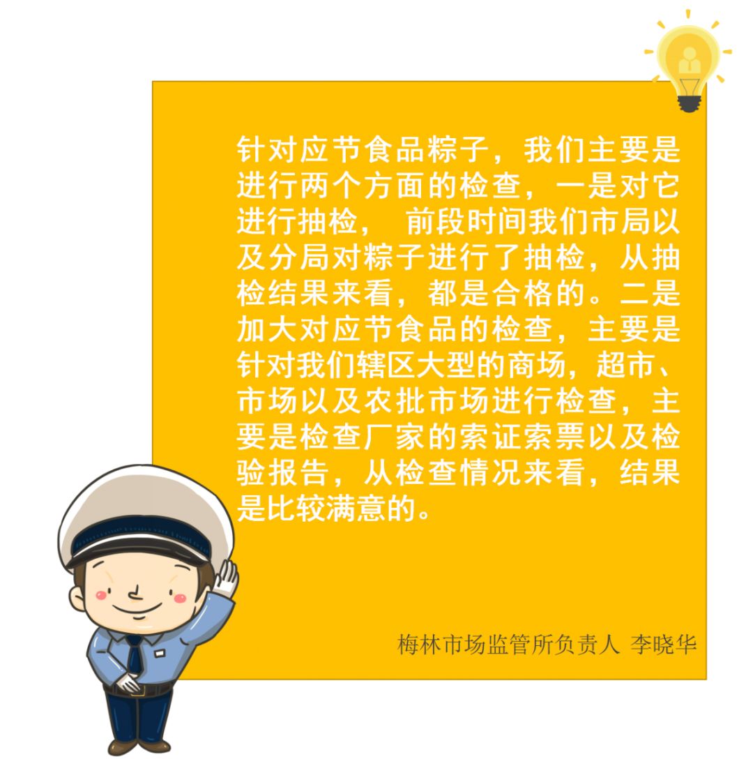 一年一度端午“粽”動員時刻到! 現(xiàn)在是不是想品嘗粽子的美味了? 肉粽肥瘦恰當(dāng)?shù)娜澫?/p> 蛋黃粽蛋黃留油的鮮潤 白粽沾綿糖的甜醇...... 于是總會來一場 甜咸粽黨battle 而有職業(yè)病的食安君只想關(guān)注安不安全 先關(guān)注下本期的【食安周報】 2019年食品安全抽樣檢驗情況通報 (第二十一期) 本次共抽檢生產(chǎn)、流通、餐飲環(huán)節(jié)應(yīng)節(jié)食品(粽子)200批次,涉及經(jīng)營主體123家次,共檢測食品指標1738項次,全部檢測合格。 全部合格 深圳的小伙伴 看完這個抽檢 吃起粽子來,就更安心啦~ 抽檢現(xiàn)場 針對應(yīng)節(jié)食品粽子 執(zhí)法人員進行兩個方面的檢查 戳視頻直擊檢查現(xiàn)場 現(xiàn)場還對制作粽子原料糯米 還有蔬菜進行快檢 糯米我們檢測了黃曲霉毒素B1 沒有發(fā)現(xiàn)問題 蔬菜樣品(農(nóng)藥殘留)抑制率都低于50% 兩個都是合格的 可以放心吃 但是你懂得怎么吃嗎? 食安君這就告訴你 吃粽子的正確姿勢? 食用過量粽子而引發(fā)消化不良的情況時常發(fā)生老人、小孩和有胃腸道基礎(chǔ)疾病的人 要格外注意! 粽子好吃但要適可而止 粽子選購秘籍 說起買粽子,食安君又要老生常談了,一定要通過正規(guī)渠道購買哦,不要購買路邊的“三無”粽子。 同時注意查看外包裝的食品標簽,如生產(chǎn)日期、保質(zhì)期、生產(chǎn)者名稱和地址、成分或配料表、食品添加劑、食品生產(chǎn)許可證編號等標識是否齊全;并仔細檢查粽子包裝是否完整,真空包裝是否漏氣漲袋,散裝粽子有無變質(zhì)現(xiàn)象等。 健康吃粽小貼士 1.粽子大多屬于高糖、高鹽、高能量食物,不宜過量食用,尤其是糖尿病、三高、肝膽等疾病患者,一定要控制食用量。 2.吃粽子時,最好搭配一些蔬菜、湯羹等,既均衡營養(yǎng),又有助消化;同時,盡量少蘸醬油、砂糖等調(diào)味料,這樣會增加鈉和糖的攝入,不利于健康。 粽子好吃不貪吃 上周,我們向市民發(fā)出了 “你點名,我們來抽檢”的倡議, 我們的食品安全快檢車就來到福田梅林 食品安全快檢車 最后 食安君還是要提醒大家 外出就餐要到證照齊全 環(huán)境衛(wèi)生的餐館 學(xué)會看“笑臉”選餐廳 不選擇無證或衛(wèi)生環(huán)境差的路邊攤 歡迎大家積極參與食品安全監(jiān)督工作 關(guān)注每周食品抽檢信息公布 欄目:食安周報 民以食為先,食以安為天,食品安全是社會各界最為關(guān)注的重點。深圳市市場監(jiān)管局聯(lián)合《第一現(xiàn)場》欄目推出《食安周報》欄目,發(fā)布食品安全權(quán)威信息,為市民帶來第一手食安資訊。 播出時間:每周二晚上7:30 播出平臺:深圳廣電《第一現(xiàn)場》 每周抽檢信息通報 定期公布最新的食品及食用農(nóng)產(chǎn)品抽檢信息。 案件現(xiàn)場 直擊市市場監(jiān)管局執(zhí)法人員現(xiàn)場執(zhí)法,以案件解讀食品安全知識,增強現(xiàn)場感。 食品安全科普 對食品安全相關(guān)知識進行科普,回應(yīng)近期食品安全相關(guān)謠言,提示食品安全風(fēng)險。 編輯整理:深圳食事藥聞 轉(zhuǎn)載請注明以上內(nèi)容
