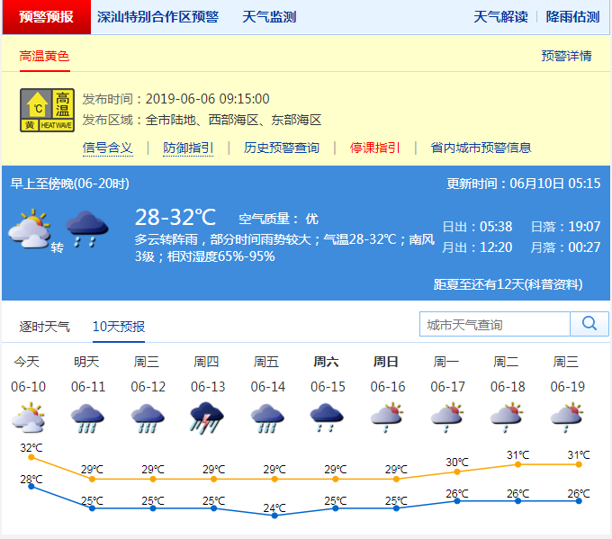 深圳新聞網(wǎng)2019年6月10日訊 在近幾日副熱帶高壓的影響下,深圳迎來了久違的“深圳藍(lán)”。不過,市民們?cè)谙硎芡ㄍ傅乃{(lán)天夏日的同時(shí),也承受著不斷升溫的“燒烤模式”。2019年6月6日上午09時(shí)15分深圳市氣象臺(tái)發(fā)布了今年的首個(gè)高溫黃色預(yù)警信號(hào),2019年6月9日羅湖區(qū)東門自動(dòng)站記錄到36.2℃高溫。氣溫圖上一片橙色紅色,簡直成了一只“紅燒雞腿”。