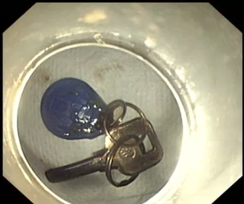 醫(yī)生準(zhǔn)備在胃鏡下取出鑰匙,不料,因鑰匙太大在常先生喉嚨附近食管入口處卡住了,取不出來,最后,醫(yī)生決定給常先生做無痛胃鏡,麻醉后,常先生食管入口處肌肉松弛,鑰匙終于順利取出!。