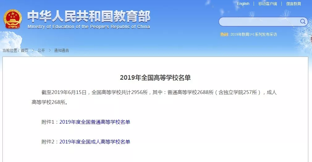 近日,教育部發(fā)布了《2019年全國(guó)高等學(xué)校名單》,截至2019年6月15日,全國(guó)高等學(xué)校共計(jì)2956所,其中普通高等學(xué)校2688所(含獨(dú)立學(xué)院257所),成人高等學(xué)校268所。