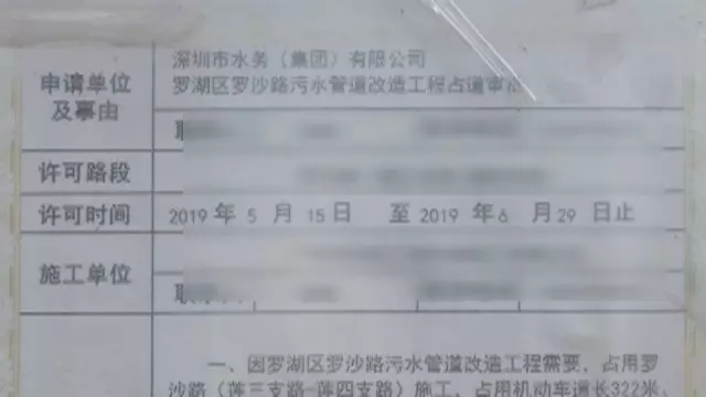 現(xiàn)場的一份施工告知書顯示,正在施工的這項工程,屬于水務(wù)集團羅沙路污水管道改造工程,獲得了占用道路挖掘許可。工程周期從5月15日開始到6月29日截止,一共45天。