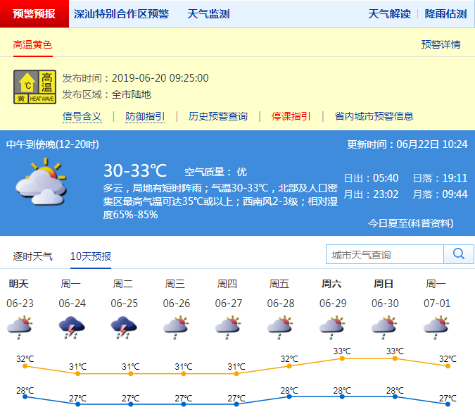 深圳新聞網(wǎng)2019年6月22日訊 受副熱帶高壓的影響,近幾日深圳氣溫持續(xù)上升,昨日(夏至)白天最高氣溫32℃~34℃,中北部及人口密集區(qū)最高氣溫達到35℃以上,全市高溫黃色預(yù)警生效中。周末恰逢中考到來(6月22日至24日),預(yù)計22日天氣炎熱到酷熱,中北部及人口密集區(qū)最高氣溫可達35℃或以上,提醒考生家長出門做好防暑降溫措施。