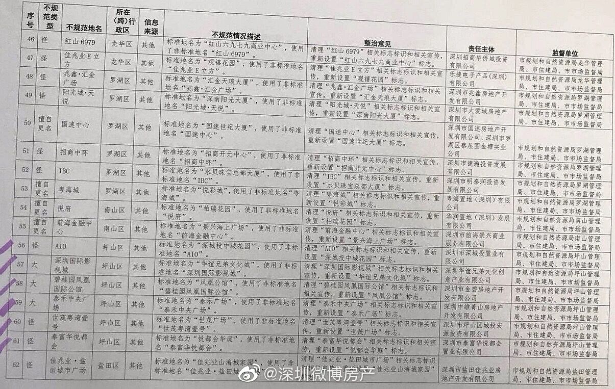 6月22日,深圳出爐了首批需清理整治的名單,涉及62個(gè)樓盤。記者從市規(guī)劃和自然資源局獲悉,深圳本次整治的重點(diǎn)為預(yù)售樓盤不規(guī)范地名使用和道路名稱不規(guī)范等問(wèn)題,使用時(shí)間較長(zhǎng)、社會(huì)和群眾認(rèn)可度較高的地名原則上不納入整治范圍。此外,整治原則上不涉及不動(dòng)產(chǎn)權(quán)證、戶口本、身份證等相關(guān)證照的變更。