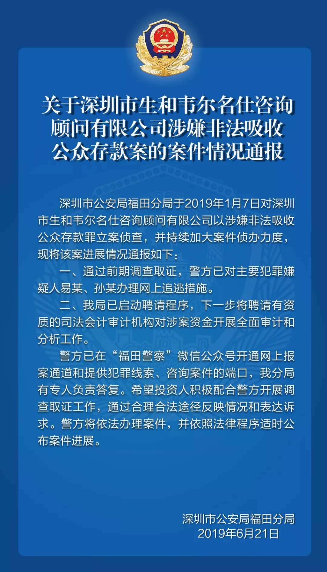 關(guān)于深圳市生和韋爾名仕咨詢顧問有限公司涉嫌非法吸收公眾存款案的案件情況通報