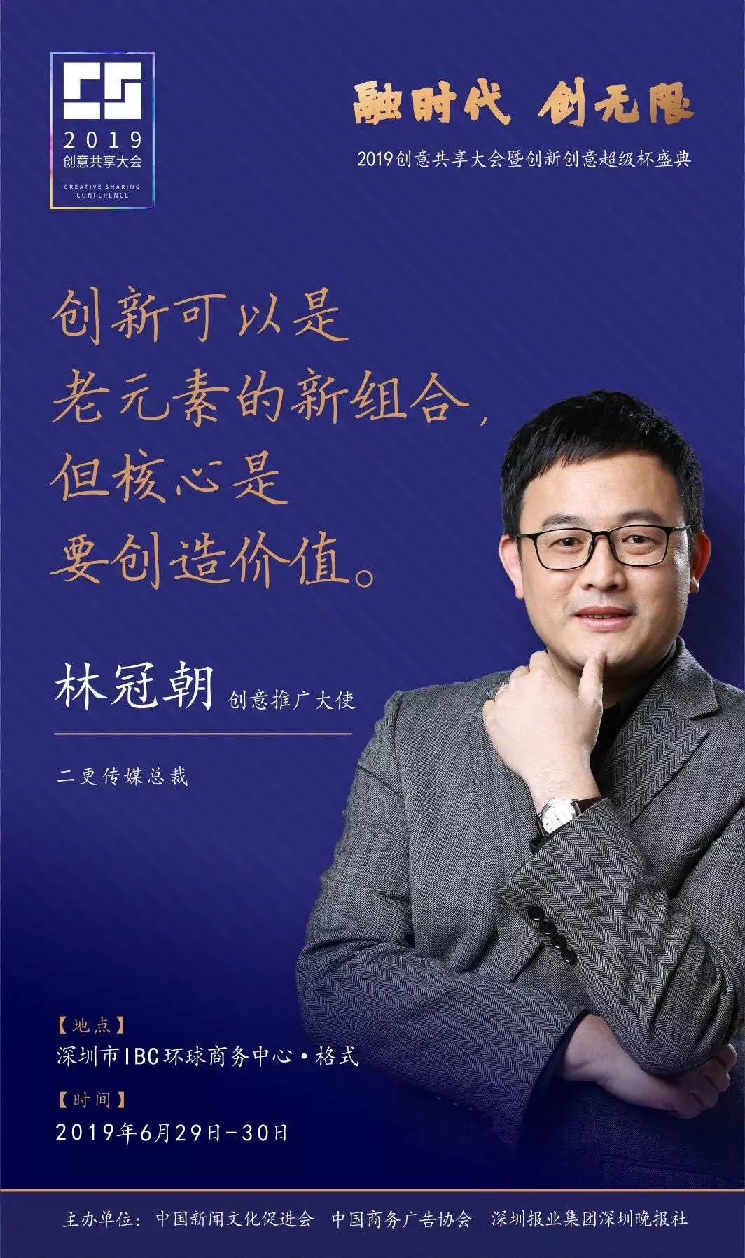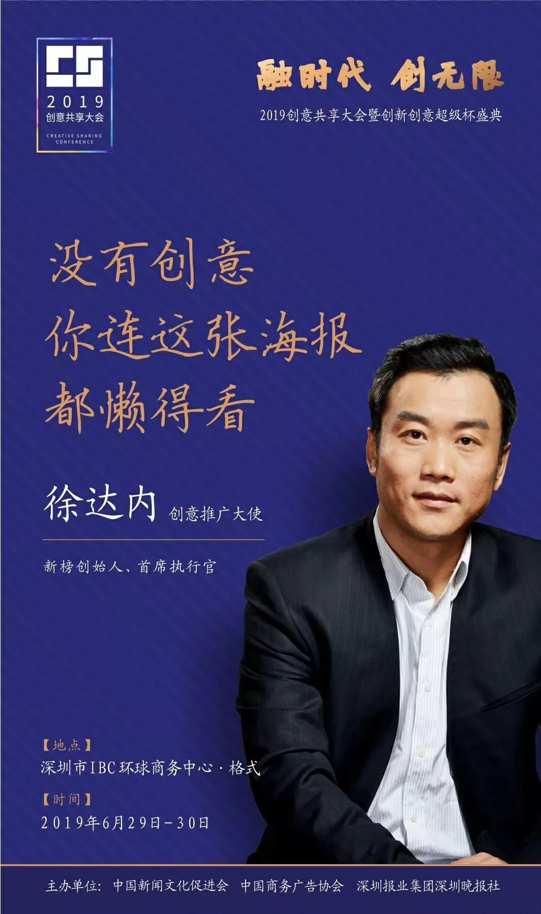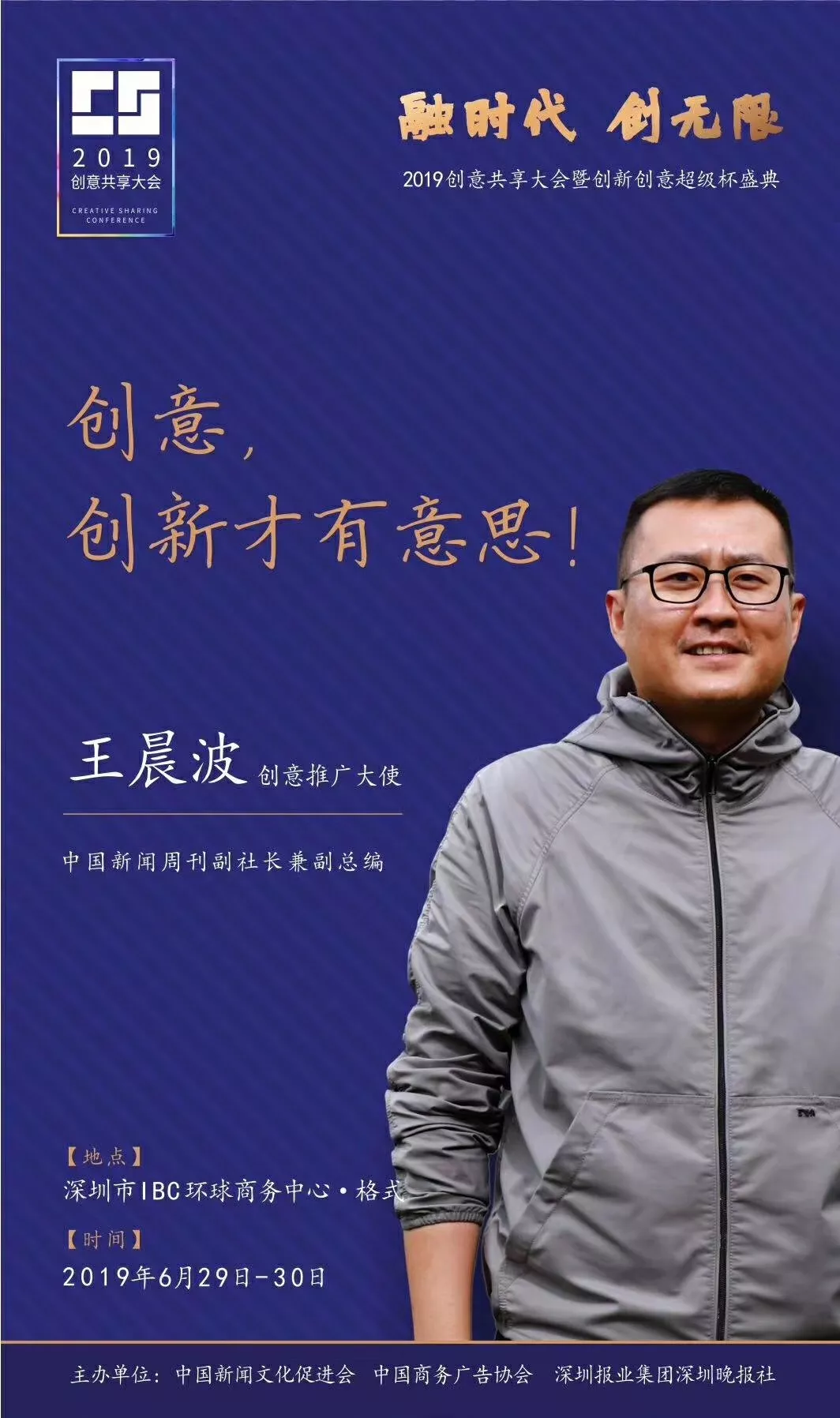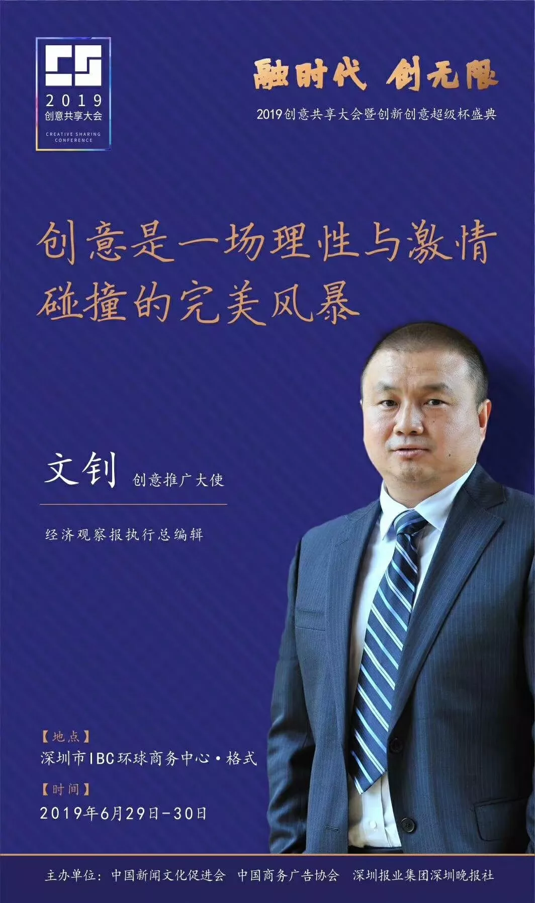為了展現(xiàn)創(chuàng)意中國(guó)的精神風(fēng)貌和創(chuàng)意傳媒的文化力量,構(gòu)建創(chuàng)新創(chuàng)意共同體,擘畫(huà)美好圖景和未來(lái)趨勢(shì),2019年6月29日至30日,由中國(guó)新聞文化促進(jìn)會(huì)、中國(guó)商務(wù)廣告協(xié)會(huì)、深圳報(bào)業(yè)集團(tuán)深圳晚報(bào)社等聯(lián)合主辦的“融時(shí)代創(chuàng)無(wú)限——2019創(chuàng)意共享大會(huì)暨創(chuàng)新創(chuàng)意超級(jí)杯盛典”將在深圳市IBC環(huán)球商務(wù)中心隆重舉辦。