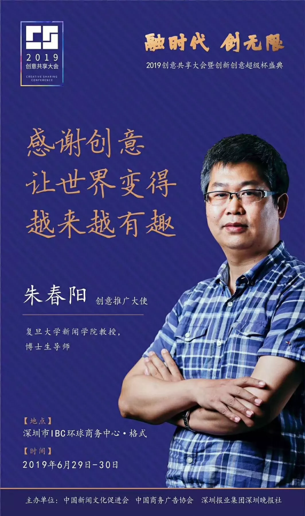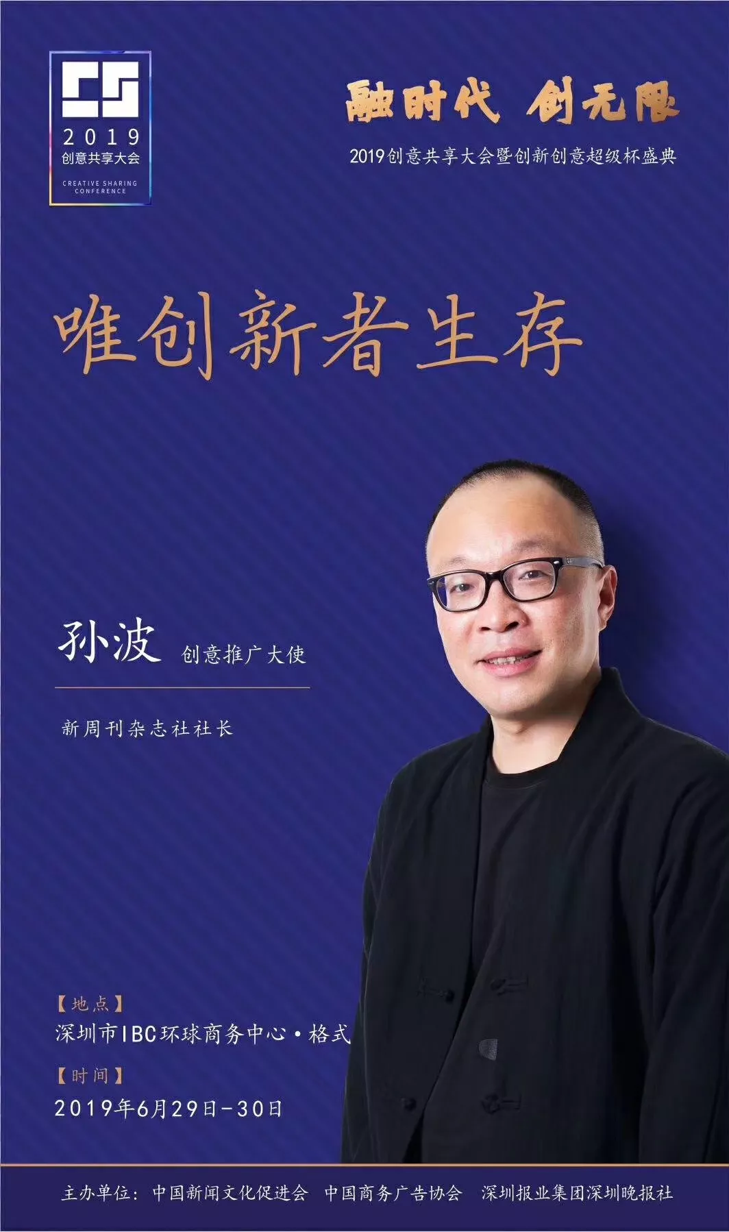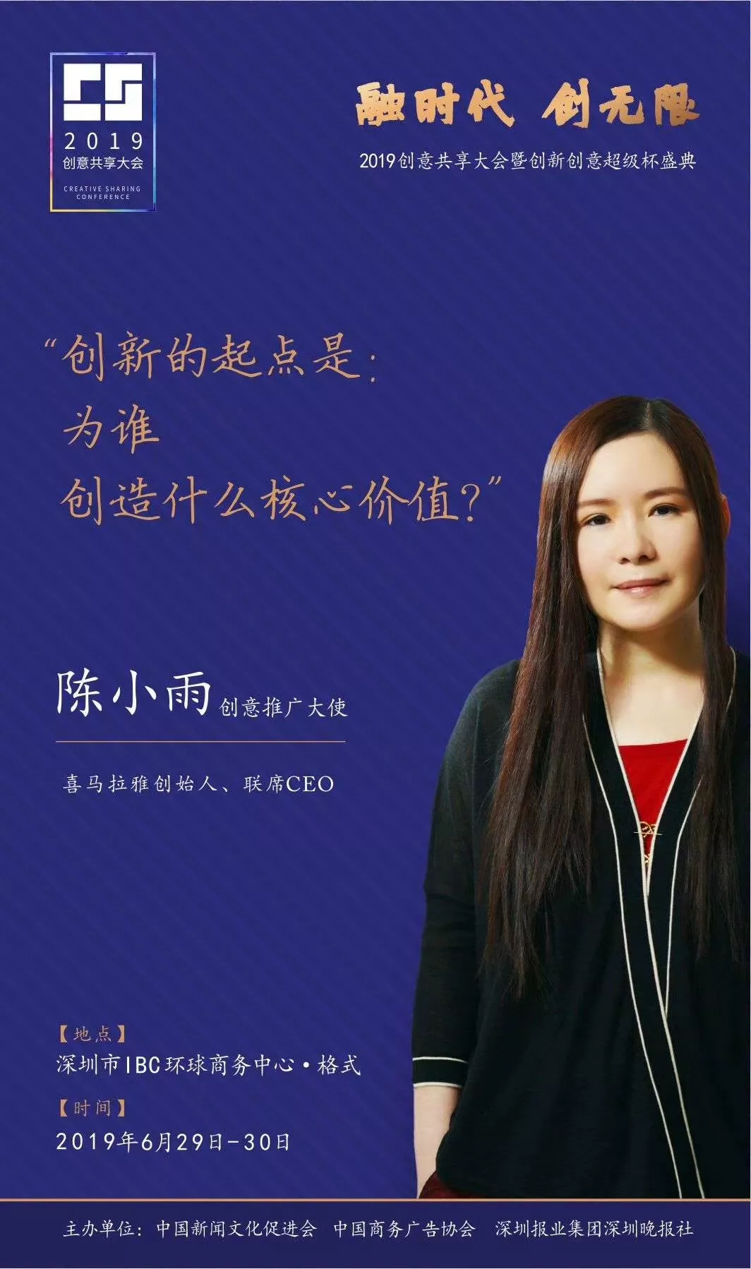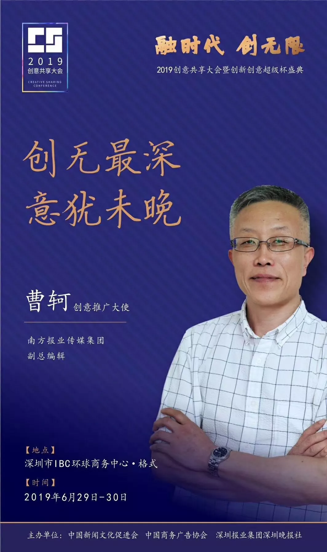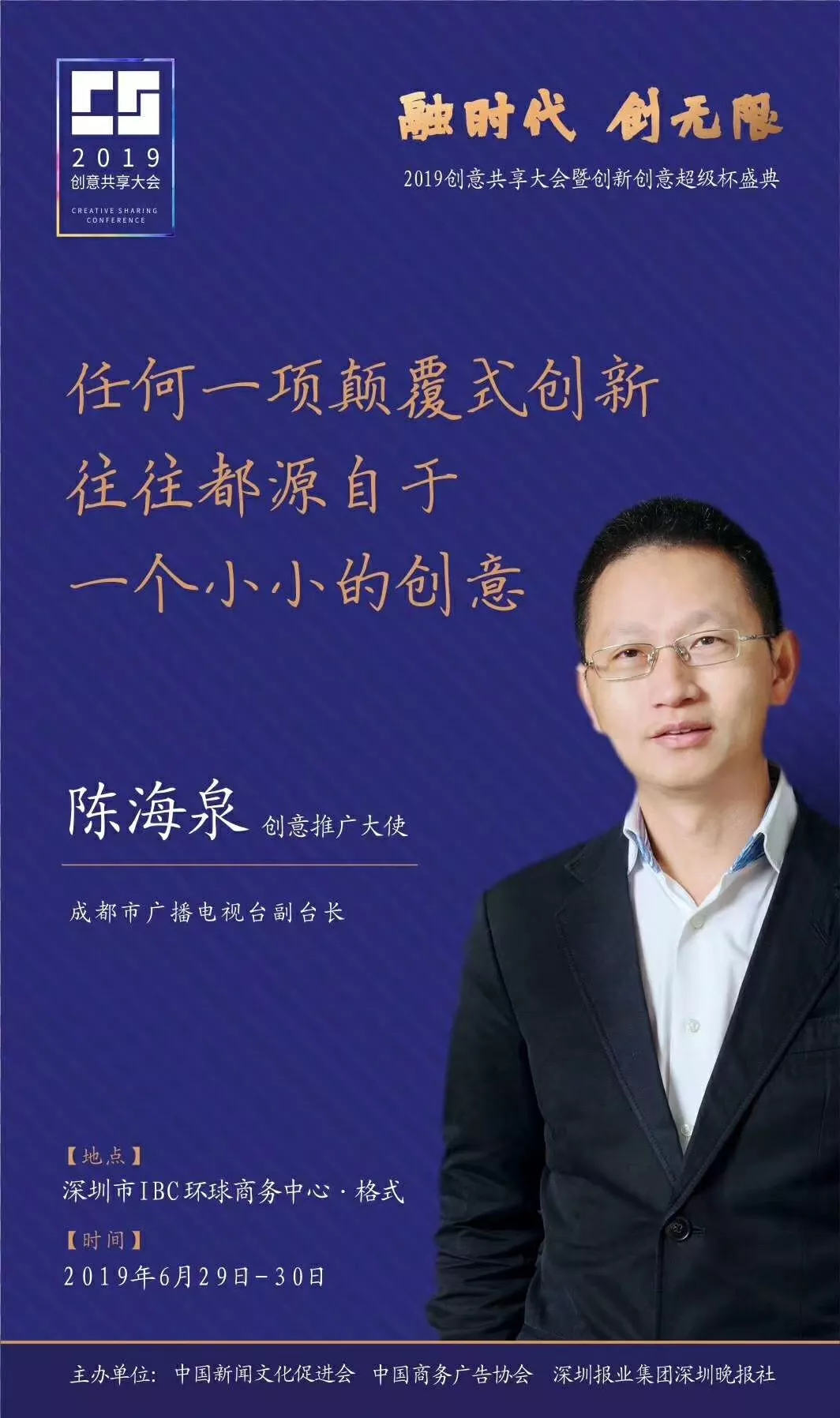 為了展現(xiàn)創(chuàng)意中國(guó)的精神風(fēng)貌和創(chuàng)意傳媒的文化力量,構(gòu)建創(chuàng)新創(chuàng)意共同體,擘畫(huà)美好圖景和未來(lái)趨勢(shì),2019年6月29日至30日,由中國(guó)新聞文化促進(jìn)會(huì)、中國(guó)商務(wù)廣告協(xié)會(huì)、深圳報(bào)業(yè)集團(tuán)深圳晚報(bào)社等聯(lián)合主辦的“融時(shí)代創(chuàng)無(wú)限——2019創(chuàng)意共享大會(huì)暨創(chuàng)新創(chuàng)意超級(jí)杯盛典”將在深圳市IBC環(huán)球商務(wù)中心隆重舉辦。