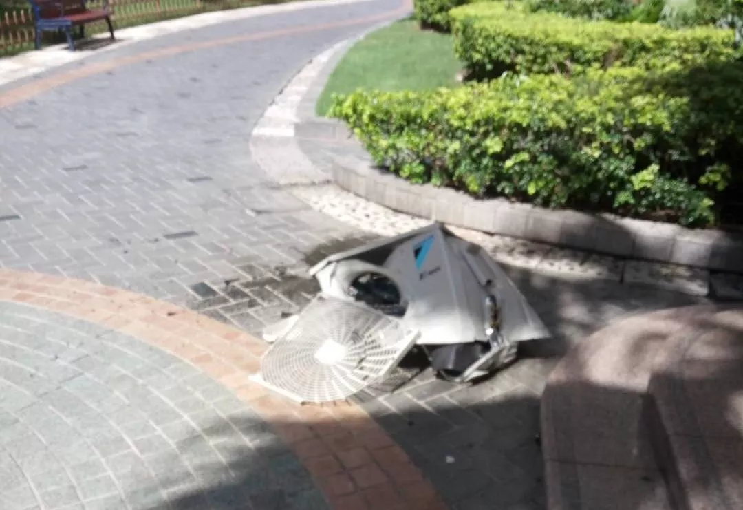 兩名業(yè)主先后經(jīng)過事發(fā)地,所幸逃過一劫。今天下午3點(diǎn)多,劉先生從家里出門,走到2棟樓下時(shí)就看到了一臺空調(diào)主機(jī)在地上,劉先生嚇了一跳。