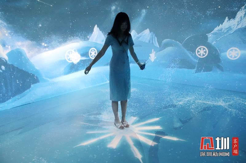 展覽還加入了體感偵測(cè)技術(shù),冰山雪景隨著光影變換而變幻,就如同艾莎女王特別為粉絲們施展的冰晶魔法:足跡所到之處,雪花和冰晶變幻各種魔法特效,用手觸摸圓圈,還能在屏幕上升騰起一朵云,或者一串飛舞的雪花。艾莎女王、安娜公主和克里斯托夫也有可能現(xiàn)身在屏幕上