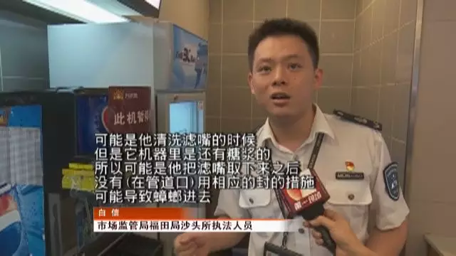 可能是他清洗濾嘴的時(shí)候,里面是個(gè)管道是空的,但是它機(jī)器里是還有糖漿的。這種糖漿特別容易吸引蟑螂或者異物進(jìn)去,所以可能是他把濾嘴取下來之后,沒有用封的措施,可能導(dǎo)致蟑螂進(jìn)去。然后把濾嘴裝上去 ,再可樂倒出來的時(shí)候,可能蟑螂就跟一起出來了 。
