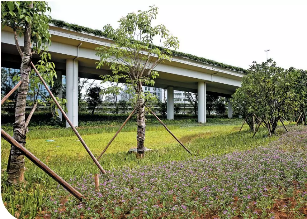 該工程將生態(tài)植草溝、生物滯留設(shè)施、溢流式雨水口、透水鋪裝、雨水檢查井與自然生態(tài)、園林景觀完美融合。