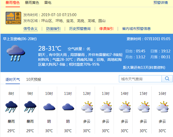 深圳新聞網(wǎng)2019年7月10日訊 7月10日早晨6時50分從深圳市氣象臺獲悉,過去1小時,龍崗區(qū)(寶龍、龍崗、龍城、園山街道、坪地街道)和坪山區(qū)累計雨量已達暴雨,預計強降雨還將持續(xù)1小時左右,深圳市氣象臺于7月10日6時45分在龍崗區(qū)(寶龍、龍崗、龍城、園山街道)發(fā)布暴雨橙色分區(qū)預警,7時15分又在坪山區(qū)和龍崗區(qū)坪地街道發(fā)布暴雨橙色分區(qū)預警。全市進入暴雨防御狀態(tài),請注意防御。全市中小學、幼兒園可視情況推遲上學。
