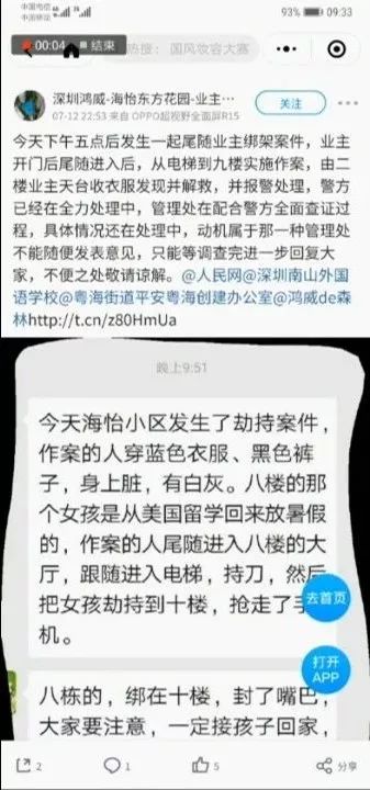 帖子下方跟著很多聊天截圖,透露被尾隨的業(yè)主是個(gè)年輕女孩,“嫌疑人持刀把女孩劫持到十樓,搶走手機(jī)”,女孩被“封住嘴巴”,還說(shuō)“嫌疑人在小區(qū)內(nèi)轉(zhuǎn)了很久尋找目標(biāo)”。記者今天中午來(lái)到位于南山科技園南區(qū)的涉事小區(qū),業(yè)主們說(shuō)這事讓他們很震驚。