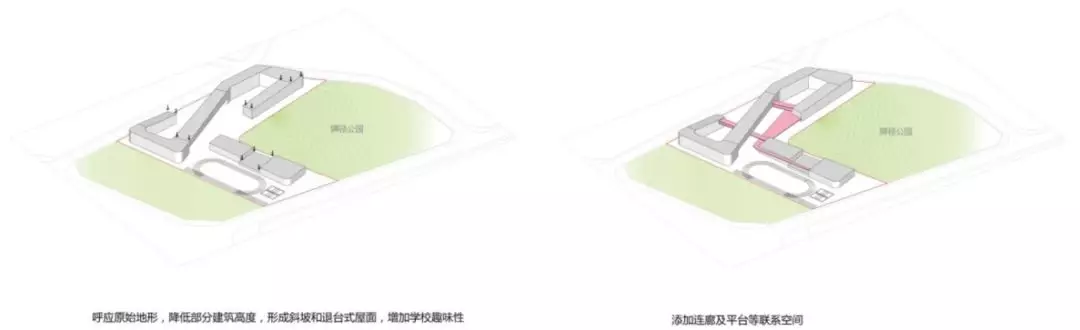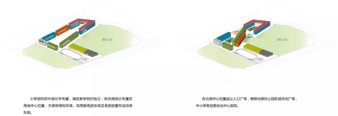 規(guī)劃采用了S型的布局關系,初中部和小學部各置一側(cè),各自有相對獨立的院落空間的同時,能夠照顧到空間的流通性,使得二者能夠方便地共享公共教學設施。