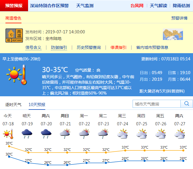 深圳新聞網(wǎng)2019年7月18日訊 受臺風“丹娜絲”外圍下沉氣流影響,昨日我市高溫天氣加劇,全市最高39℃,出現(xiàn)在羅湖區(qū)東湖街道。市氣象臺于昨日14時30分將全市高溫黃色預(yù)警信號升級為橙色。這也是今年我市首個高溫橙色預(yù)警信號。