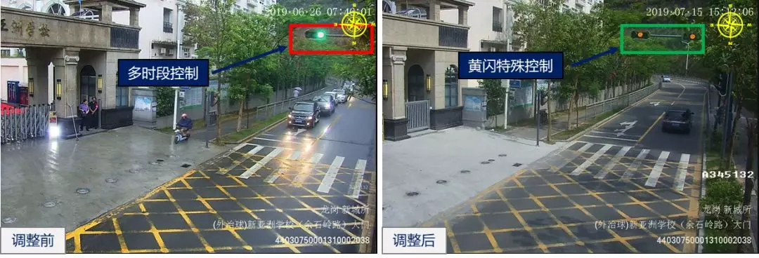 龍崗怡翠/新亞洲學(xué)校路口行人過街需求主要集中于上下學(xué)期間,近期暑期開始,行人過街需求小,路口調(diào)整至全天黃閃控制模式,以提高機動車通行效率。